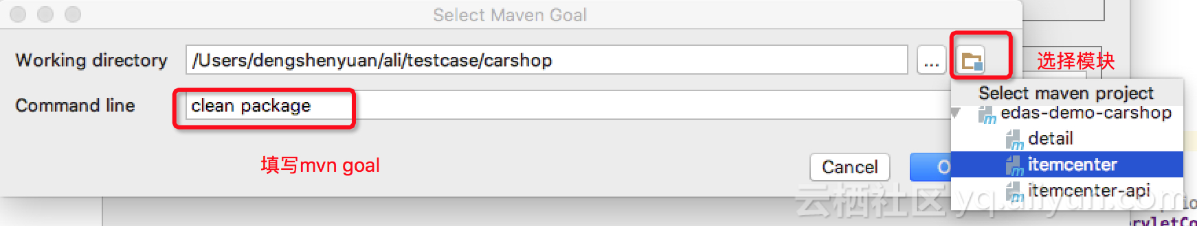 在弹出的界面上,可以点击文件夹小图标来选择模块,在"Command line"上填写mvn goal: