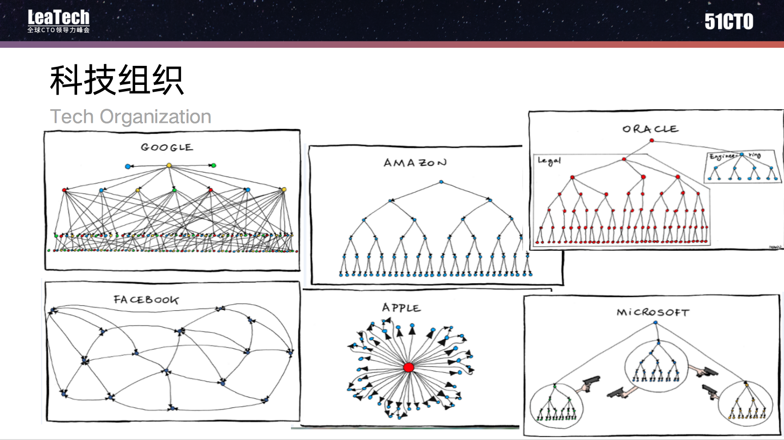 上图是一些大家耳熟能详的漫画,介绍了几种典型的科技公司的科技团队架构形式。