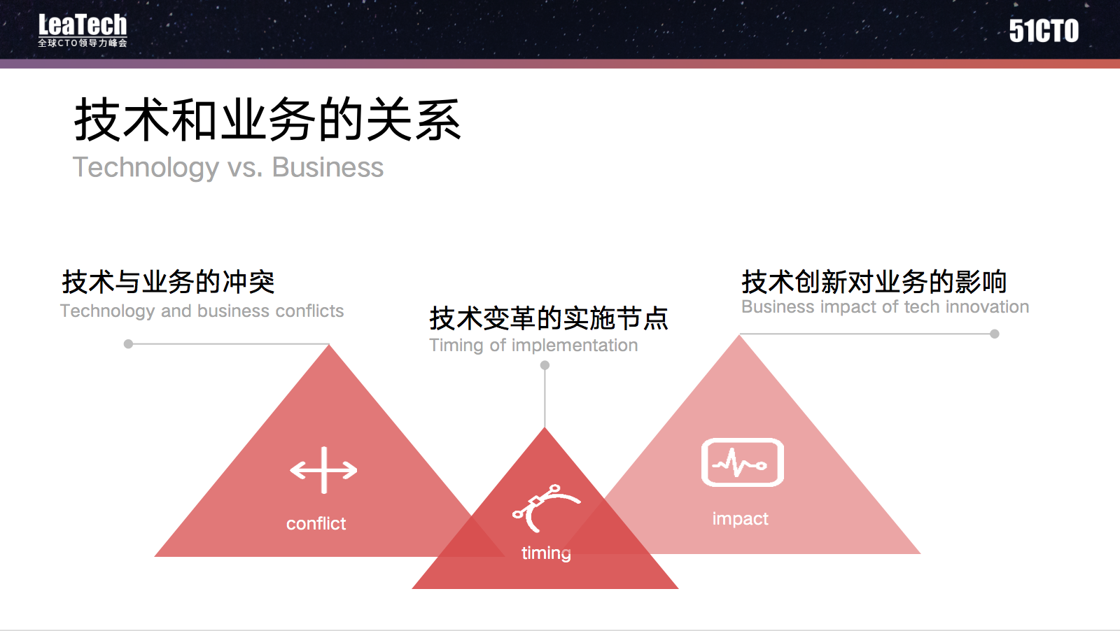 技术和业务除了相辅相成的关系外,还存在一定的冲突。其实技术和业务的冲突在大家平时的工作中经常见到,比如业务同事着急上线一个功能来做活动;而技术觉得要达到同样的目的,我们可能需要好的设计和架构,而不是简单做一个临时补丁式的功能,这就是很常见的技术和业务的冲突。
