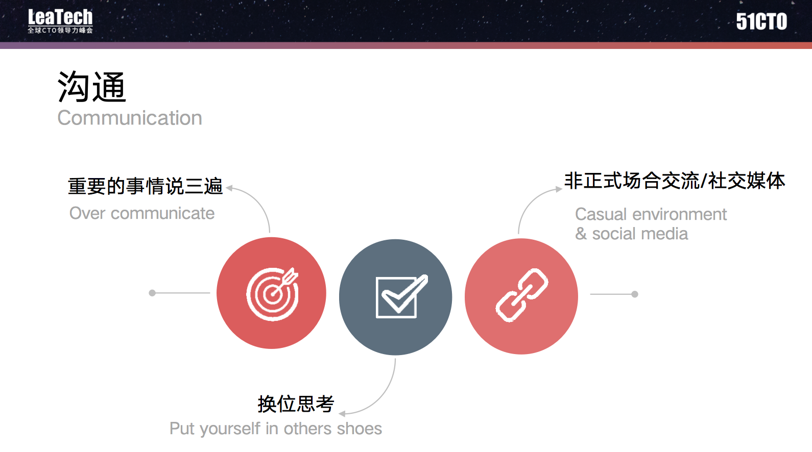 沟通每天都在进行,比如各种大大小小的会议。我发现不管开多少会,高层领导的想法、思路并不一定能被所有同事理解,因为沟通方式、沟通渠道的原因,信息不能触达到所有人,需要重复很多遍。