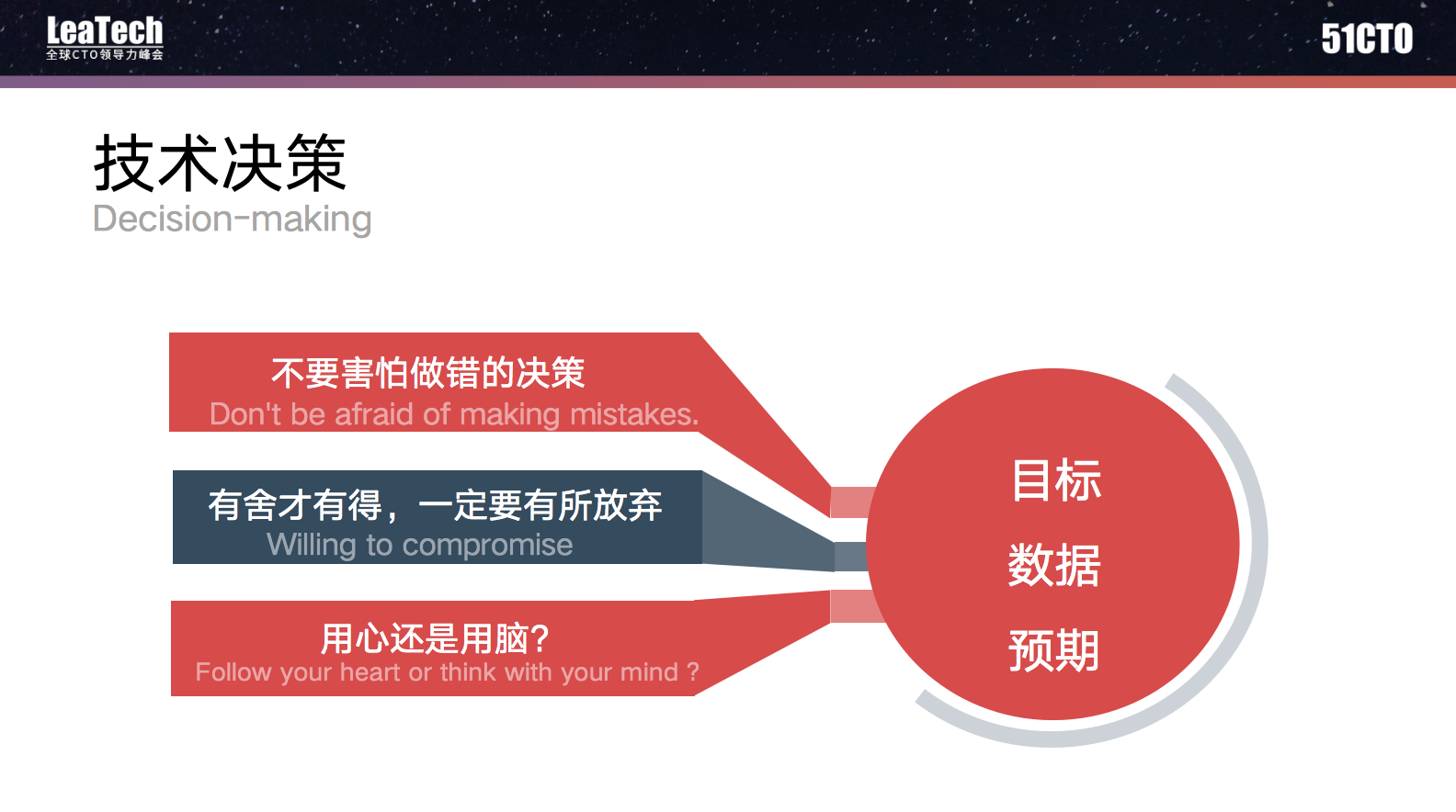 有时候即使你做出了错误的决定,但大家一起努力执行的时候,可能可以逐步调整转变从而达成正确的结果。技术管理人一定要懂得取舍,通过大脑计算,明确目标,了解关联方,分析可选项和利弊,基于目标、数据和对未来的预期做出决策。