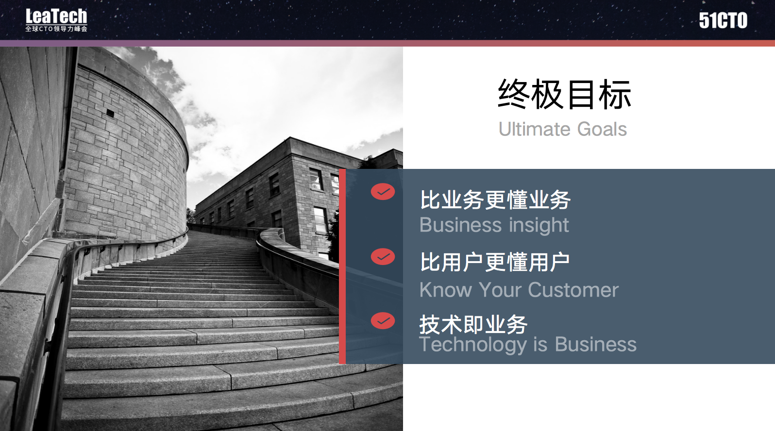 最后的终极目标是,希望科技团队能够做到比业务更懂业务,比用户更懂用户,让技术本身变成公司核心的业务。我认为如果能做到科技团队在公司起到了核心的作用,这才是永生的价值。