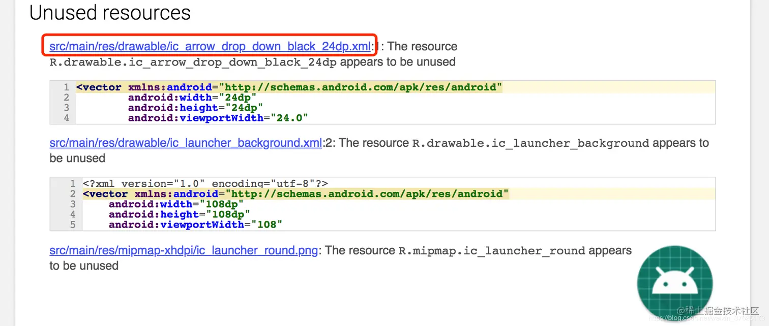 /Users/zinc/Documents/code/gradle/GradleStudy/app/src/main/res/drawable/ic_arrow_drop_down_black_24dp.xml:1: Error: The resource R.drawable.ic_arrow_drop_down_black_24dp appears to be unused [UnusedResources]