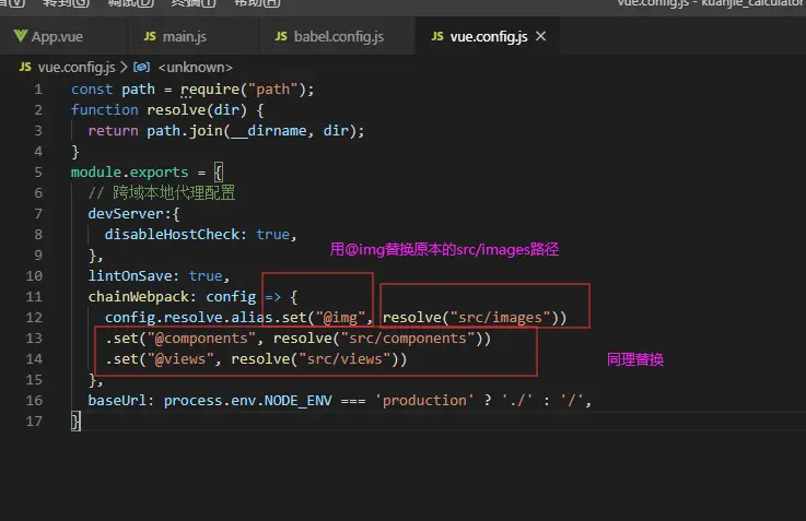 const path = require("path");function resolve(dir) { return path.join(__dirname, dir);}module.exports = { // 跨域本地代理配置 devServer:{ disableHostCheck: true, }, lintOnSave: true, chainWebpack: config => { config.resolve.alias.set("@img", resolve("src/images")) .set("@components", resolve("src/components")) .set("@views", resolve("src/views")) }, baseUrl: process.env.NODE_ENV === 'production' ? './' : '/',}