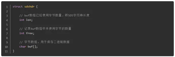 基于C语言中传统字符串的缺陷,Redis自己构建了一种名为简单动态字符串的抽象类型,简称SDS,其结构如下: