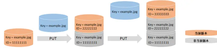 在启用了“版本控制”的Bucket中,上传相同键值的对象时,新上传的数据将成为该对象的当前版本,而原有的对象将以历史版本的形式保存下来。能够防止意外覆盖或者删除对象,并且提供查询、恢复历史版本的机会。