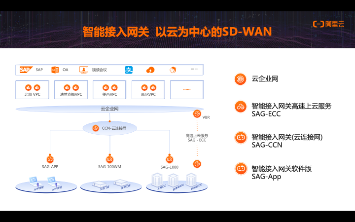 阿里云云原生SDWAN解决方案主要产品包含1)云企业网,是全球广域网的解决方案,把阿里云所有的服务连接在一起。结合阿里云云连接网,起到了混合云连接的作用,让企业上云更加容易、便捷、弹性。2)智能接入网关—高速上云服务,结合阿里云智能接入网关,可以让客户的专线变得更加智能,并透过云连接网做专线备份。 3)智能接入网关软件版:支持苹果、安卓、Windows。并有SDK版本,可以让应用厂商集成。