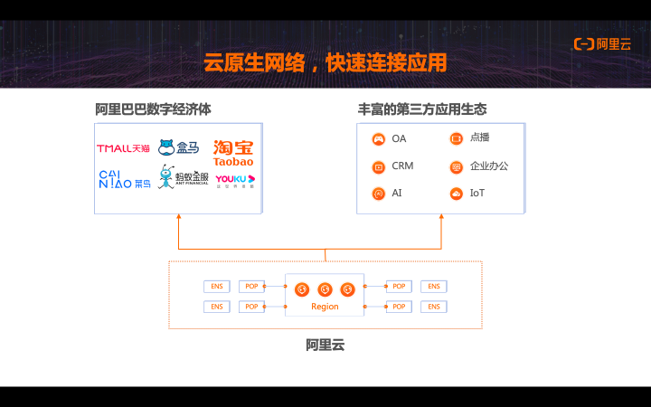 于是在这个趋势下,阿里云提供了SD-WAN服务,包含一云多端,而且是多个厂商的端。再来是多网接入,解决跨运营商、多运营商、跨国之间的网络。而未来谈到SD-WAN网络的时候,不仅是管道,更是快捷、方便和触达应用的能力,打通与云服务的连接,让业务开发者快速地使用云上的各种服务,包含计算、负载均衡、存储、安全等,还有各种PaaS服务及大数据分析工具、第三方应用以及阿里巴巴新零售、新金融的解决方案。而阿里云已经部署了全国POP,让网络可以更快捷地触达业务,大幅提高企业信息化。