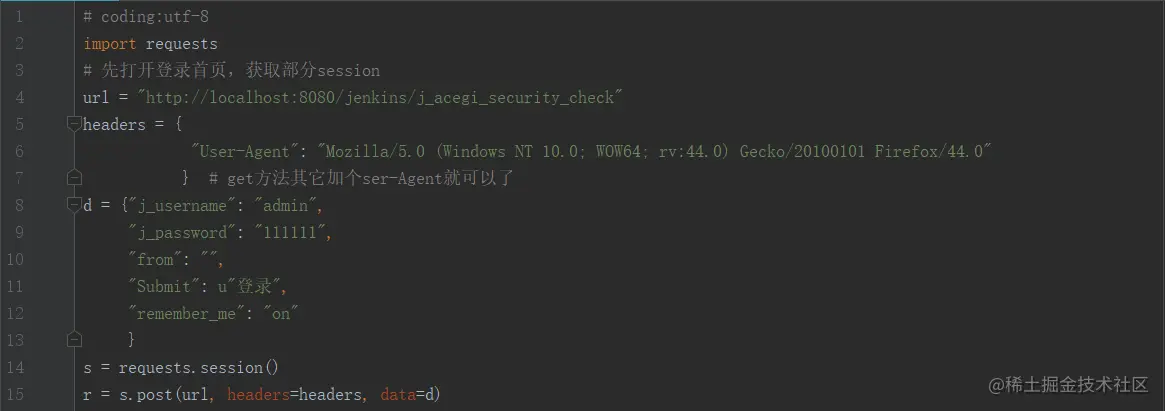 上一篇cookie绕过验证码模拟登录博客园,但这只是第一步,一般登录后,还会有其它的操作,如发帖,评论等等,这时候如何保持会话呢?这里我以jenkins平台为例,给小伙伴们在沙场演练一下。