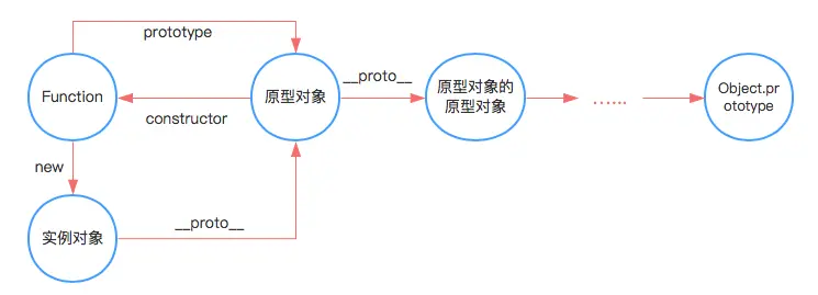 在 Js 中,每个函数都有一个 prototype 属性,其指向该函数的原型对象。而函数的原型对象中,有一个 constructor 属性,指回向该函数。当函数被当作构造函数,使用 new 运算符生成实例时,在生成的实例对象中有一个内部属性 __proto__ 属性,该属性也指向函数的原型对象。在原型对象上有 __proto__ 指向原型对象的原型对象,依次传递,直到指向 Object.prototype 对象为止,即构成了原型链。如下图所示: