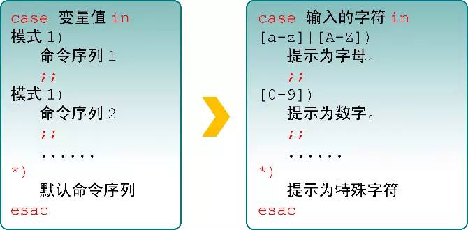 数据,若匹配成功则执行相关命令并结束整个条件测试;而如果数据不在所列出的范围内,则会去执行星号(*)中所定义的默认命令。