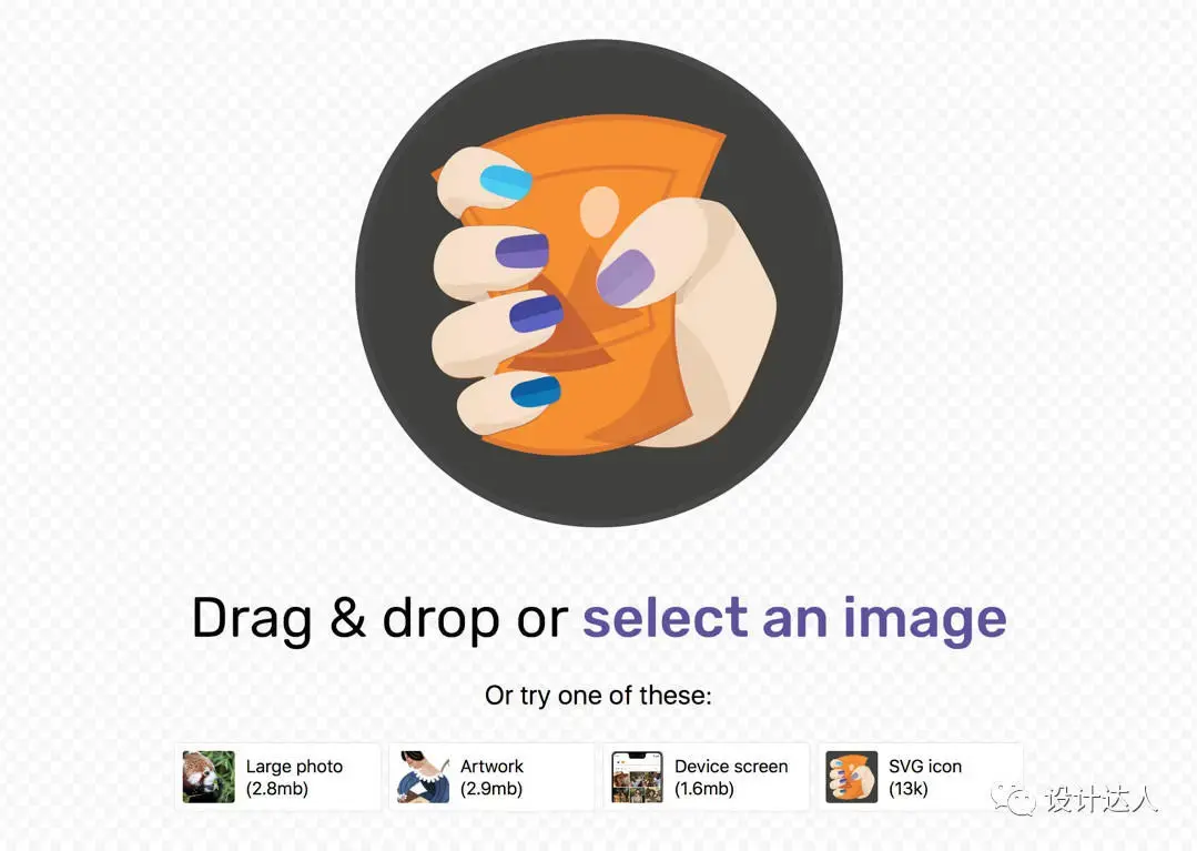 打开 squoosh 网站,你会看到如下界面,把要压缩的图像直接拖到网页界面里,或者点「select an image」方式选择图像。