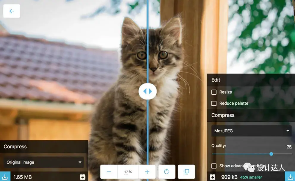 左右面板:左右的面板都可以同时设置,通常左边用原图「Original image」,右边设置压缩率。