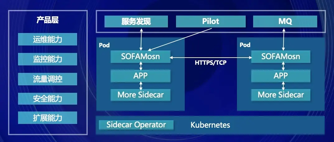 数据面 SOFAMosn 是独立出来的进程,它可以跟 APP 进行交互,和 APP 在一个 POD 里。图中除了 SOFAMosn 承载了 APP 之间的通信任务之外,还将异步消息的通信逻辑也沉淀进去了,成为应用对外同步异步通信的统一门面。同时我们也把应用访问数据库的中间层路由逻辑和配置管理逻辑独立成一个 sidecar,称之为 DBMesh,这个图里用 More Sidecar 来表示,意味着未来可能有更多的逻辑可以下沉到 Mesh 层。