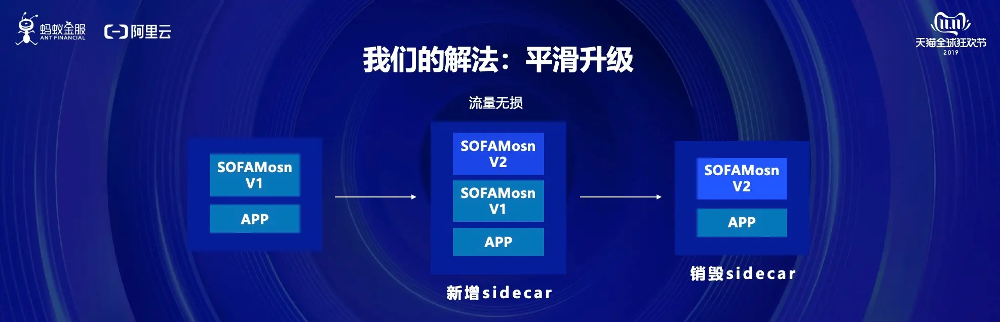 我们探索了独立升级 sidecar 的模式,并且实现了较为复杂的流量热迁移。整个过程应用完全无感知,就像是我们给别人打电话,如果对方是个双胞胎,当话筒被另一个接过去时,我们还是面对的同样的电话,同样的通话通道,对方换了个人,我们无感知。这样整个升级过程非常的平滑,也对业务无打扰,流量也不会出现波动,符合金融级对稳定性的要求。