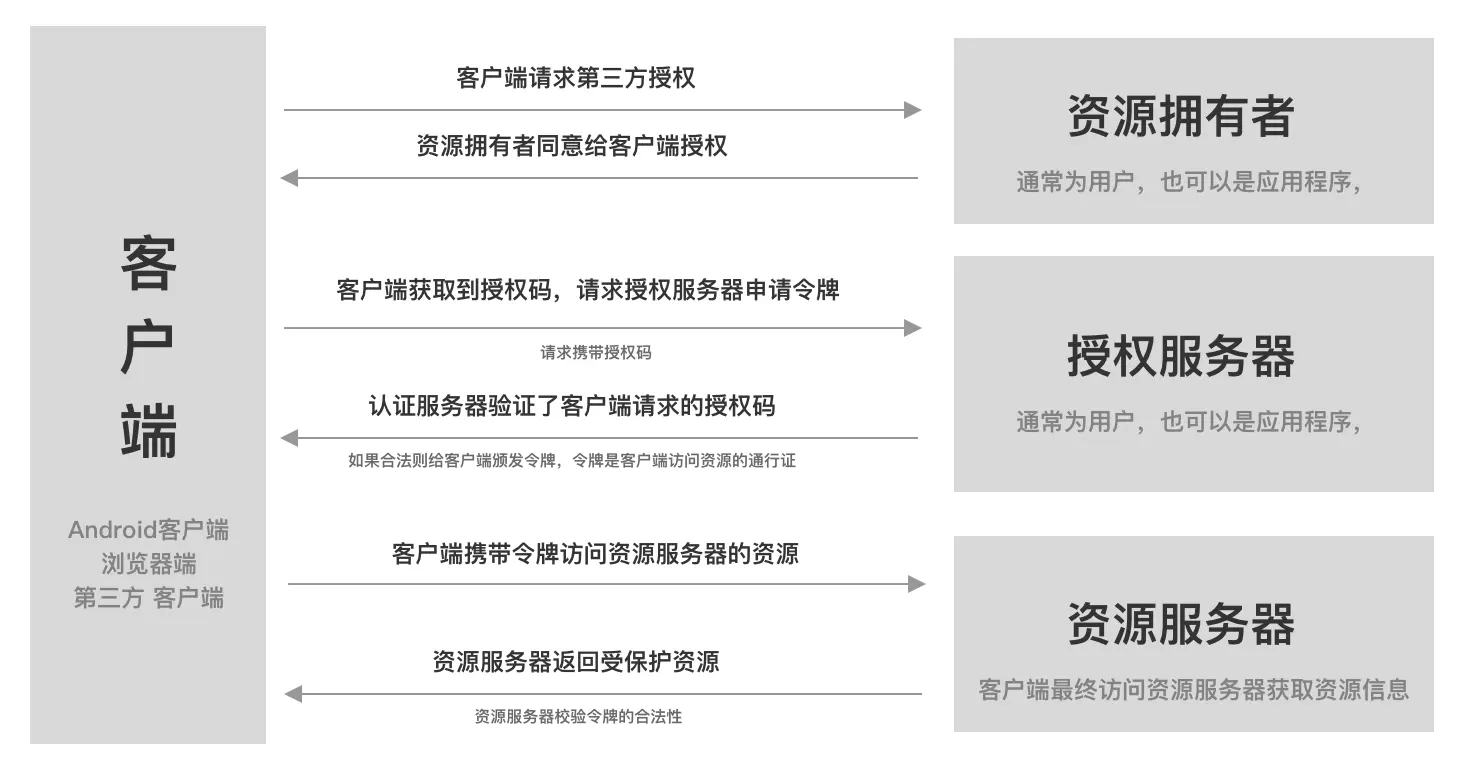 4、资源服务器 存储资源的服务器,比如,xx用户管理服务器存储了xx的用户信息,xx订单服务器存储了xx的订单信息,微信的资源服务存储了微信的用户信息等。客户端最终访问资源服务器获取资源信息。