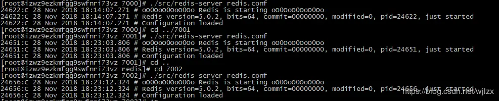 7、由于redis集群至少需要3个主节点,每个主节点至少需要1个从节点,因此至少要有6个节点,所以需要另找一台机器,重复1-6的步骤,这里由于只做测试,因此在同台机器部署了6个节点,然后在任一节点根目录下创建集群
