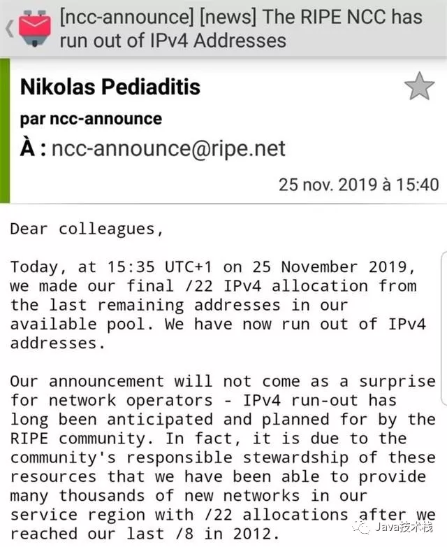 就在 2019/11/25 UTC+1 15:35 时,一封来自欧洲 RIPE NCC 的邮件中得到确认:全球的IPv4地址已经彻底耗尽。
