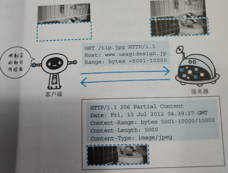 - multipart/byteranges,状态码206,部分内容响应报文包含了多个范围的内容是使用