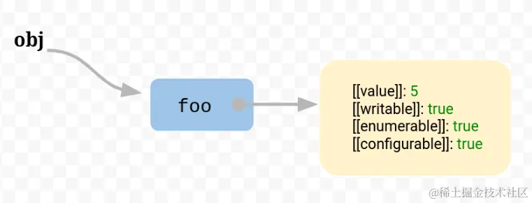 将一个对象{foo : 5}赋值给一个变量obj,相当于把这个对象的内存地址赋值给变量obj。 原始对象以字典结构保存,也就是每一个属性名对应一个属性描述对象,那么上面的对象中foo属性实际上是以下面的方式保存的:
