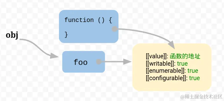 这时,引擎会将函数单独保存在内存中,然后再将函数的地址赋值给foo属性的value属性。
