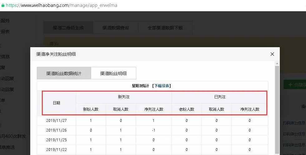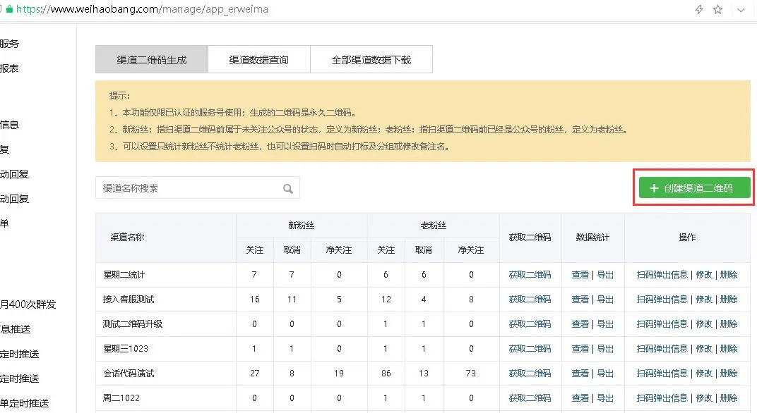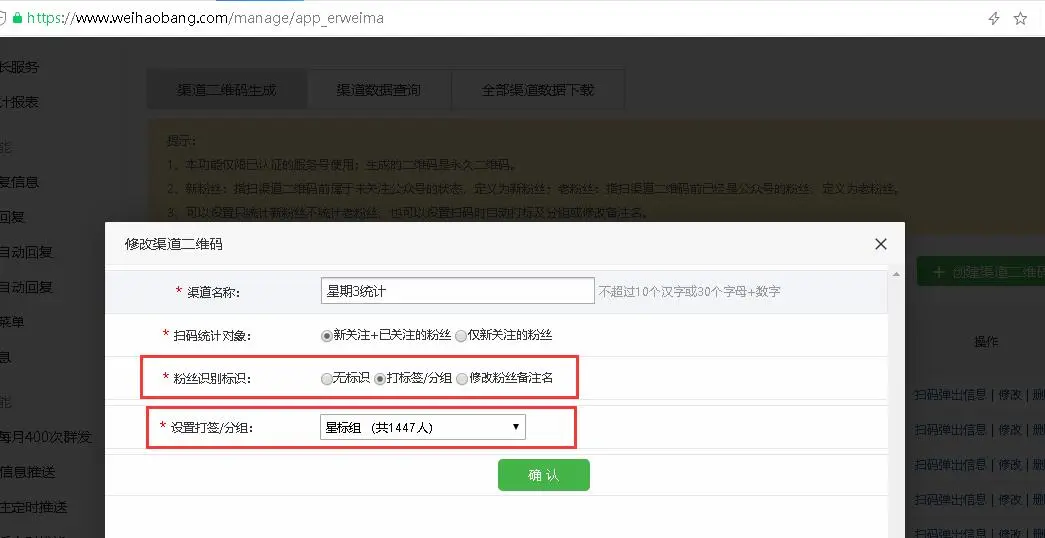 二维码参数设置完后,粉丝关注取关都能统计到,一个二维码代表一个渠道,也可以给粉丝打标签分组或修改备注名。