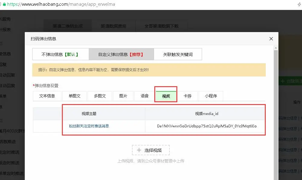 公众号参数二维码在微号帮平台生成后,微号帮支持二维码回复文本信息、图文消息、卡券、小程序、图片、音频、视频类型,还可以关联关键词回复功能。