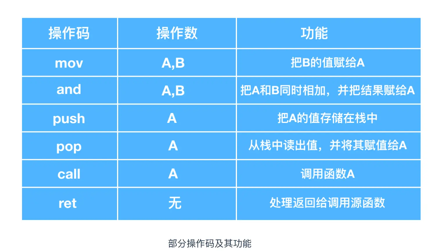能够使用何种形式的操作码,是由 CPU 的种类决定的,下面对操作码的功能进行了整理。
