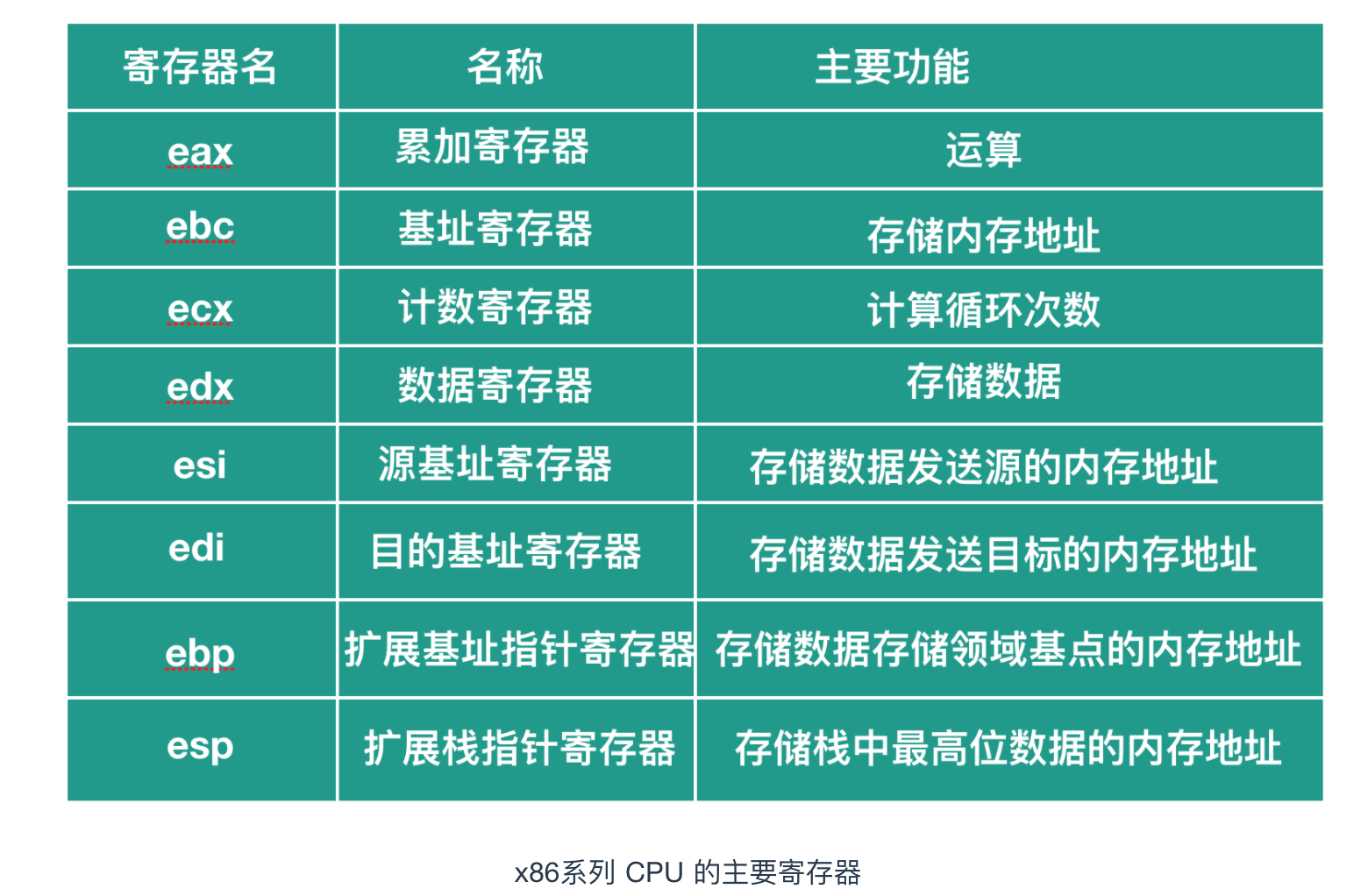 寄存器是 CPU 中的存储区域,寄存器除了具有临时存储和计算的功能之外,还具有运算功能,x86 系列的主要种类和角色如下图所示