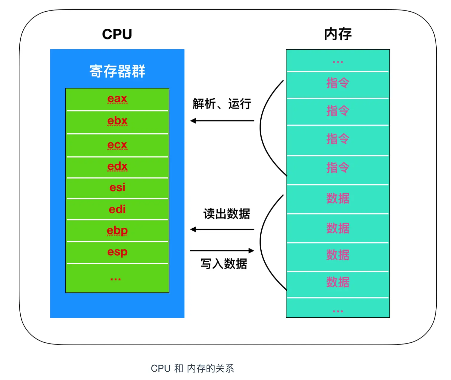 本地代码需要加载到内存后才能运行,内存中存储着构成本地代码的指令和数据。程序运行时,CPU会从内存中把数据和指令读出来,然后放在 CPU 内部的寄存器中进行处理。
