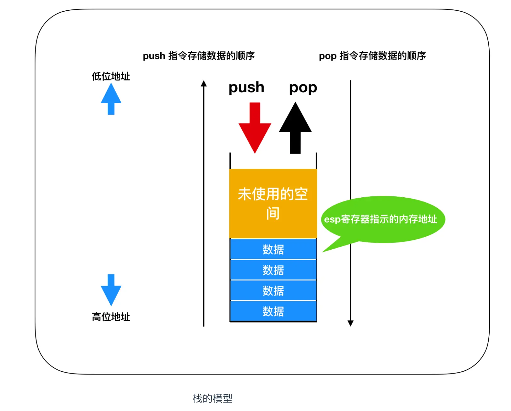 栈是存储临时数据的区域,它的特点是通过 push 指令和 pop 指令进行数据的存储和读出。向栈中存储数据称为 入栈 ,从栈中读出数据称为 出栈,32位 x86 系列的 CPU 中,进行1次 push 或者 pop,即可处理 32 位(4字节)的数据。