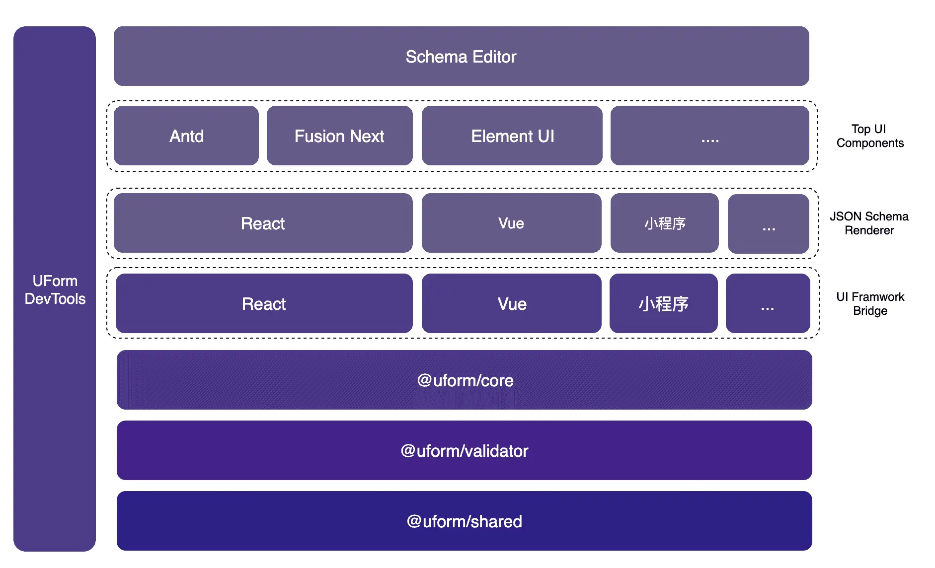 整体来看,UForm未来是要打造一个完整的表单体系化的生态,目前UForm v1花了很大精力在研发核心底层,主要原因就是为了给上层生态体系打下坚实基础。
