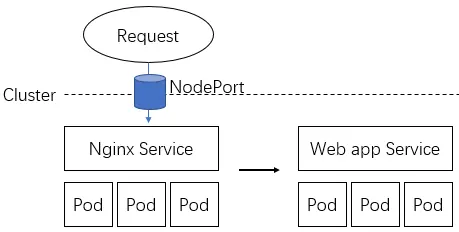 分别部署两组服务,一个是 web app 的 service 和 deployment,另一个是 nginx,用户直接访问的是 nginx 的 service,再由 nginx 转发到 web app 所在的 service,这种过程与传统 nginx 的部署方式很相似,只需要将 proxy_pass 地址改为 k8s 内部 dns 可以解析的域名:my-svc.my-namespace.svc.cluster-domain.example,结构类似如下: