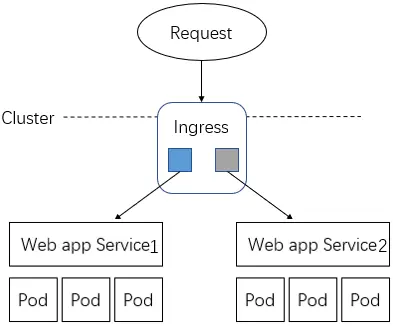 使用 Ingress,外部请求首先访问的是 Ingress,然后将请求分发到不同的 service,这样不必再另外创建一个 nginx 的 deployment ,结构如下: