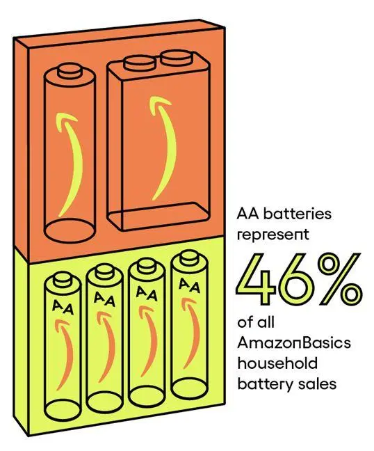 据消费者交易信息分析公司1010data提供的数据显示,AA电池占据AmazonBasics近一半的销售额,占在线购买量的46%。在AmazonBasics上,每花费的10美元中,就有1美元是用在电池上的,AA碱性电池大约占该品牌总销售额的4%。这使得AmazonBasics在在线AA电池市场处于领先地位,超过了我们熟悉的Energizer和松下等品牌。