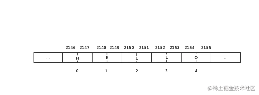 我们来看Python中的例子,一个文本字符串 HELLO 是以一列有序字符的形式存储的,假定该字符串的每个Unicode字符需要两个字节的存储空间。最下面的数字就是该字符串的索引值。