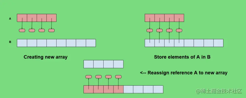 所以实现一个动态数组的实现的关键是——如何扩展数组?当列表list1的大小已满时,而此时有新的元素要添加进列表,我们会执行一下步骤来克服其大小限制的缺点: