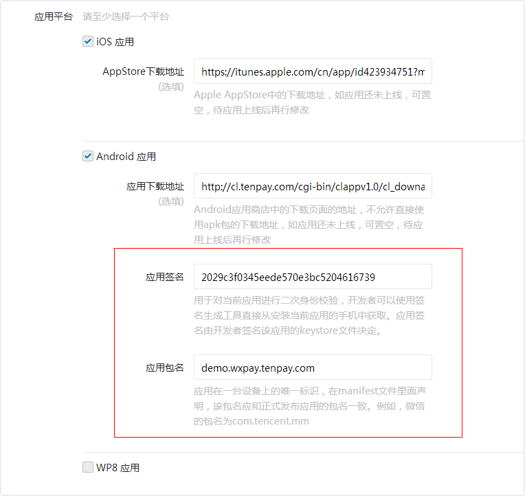 商户在微信开放平台申请开发应用后,微信开放平台会生成APP的唯一标识APPID。由于需要保证支付安全,需要在开放平台绑定商户应用包名和应用签名,设置好后才能正常发起支付。设置界面在【开放平台】中的栏目【管理中心 / 修改应用 / 修改开发信息】里面,如图红框内所示