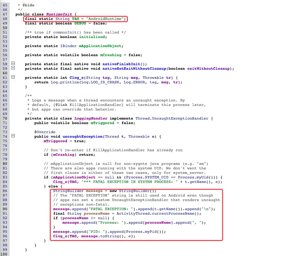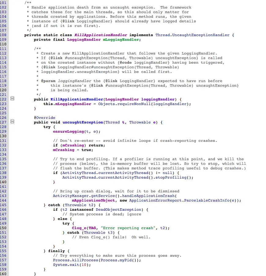 在RuntimeInit.java中,找到了对应的异常日志输出位置,从代码注释上,我们找到了关键的KillApplicationHandler和UncaughtExceptionHandler类,先看下KillApplicationHandler类。