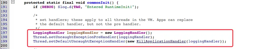 由于App进程启动时,系统已经在RuntimeInit.java类中注册了一个默认的异常预处理器loggingHandler。