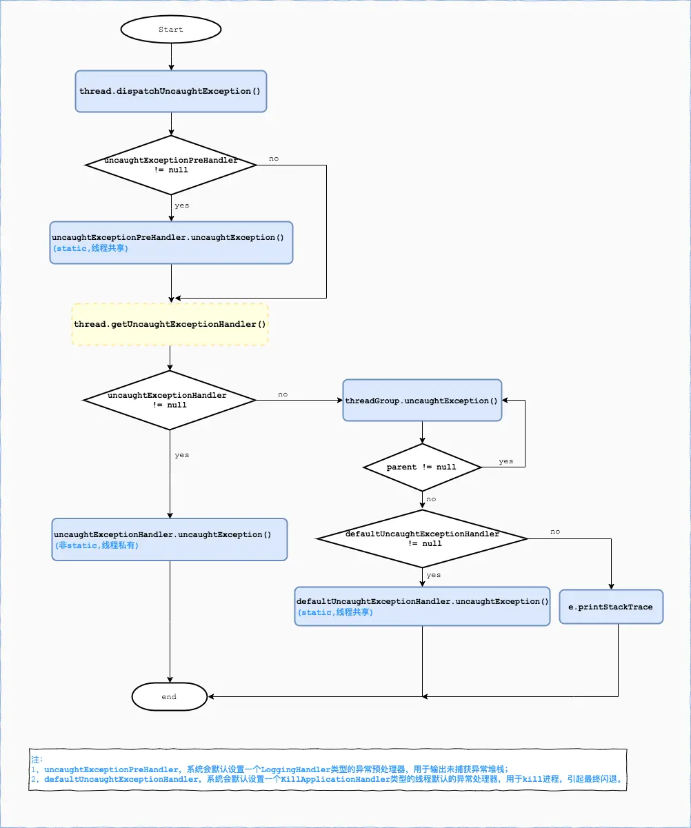 当线程私有的uncaughtExceptionHandler变量为空时,此时调用到。ThreadGroup的uncaughtException方法。这个方法内部逻辑稍显复杂,具体流程如下: