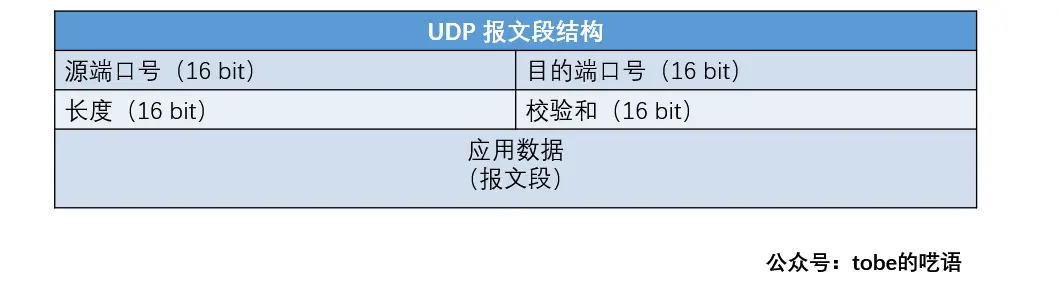 说实话,UDP 的报文段结构比 TCP 报文段简洁多了(见下图),毕竟 UDP 协议就没有什么多余的机制。