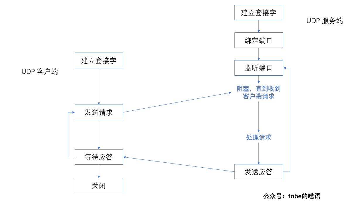 最后,这是一张客户端与服务端利用 UDP 协议通信的流程图:
