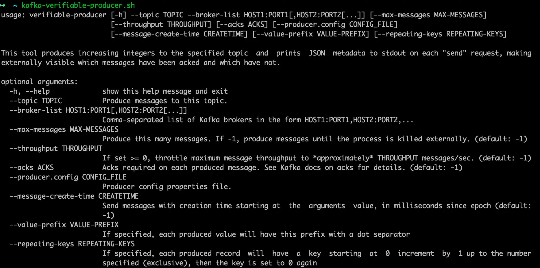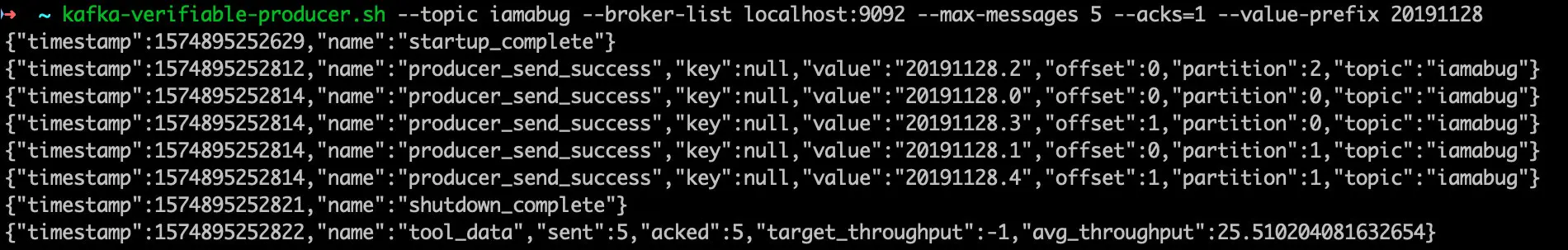 VerifiableProducer 可以按照我们指定的参数来发送一定数量的消息,消息内容为从 1 开始递增的数字,参数包括 acks,重试次数和发送速率等等,运行时会打印每条消息发送成功或失败。VerifiableConsumer 消费 VerifiableProducer 生产的消息,按照消费顺序打印消息内容,并且打印提交 offset 和分区重分配的消息。