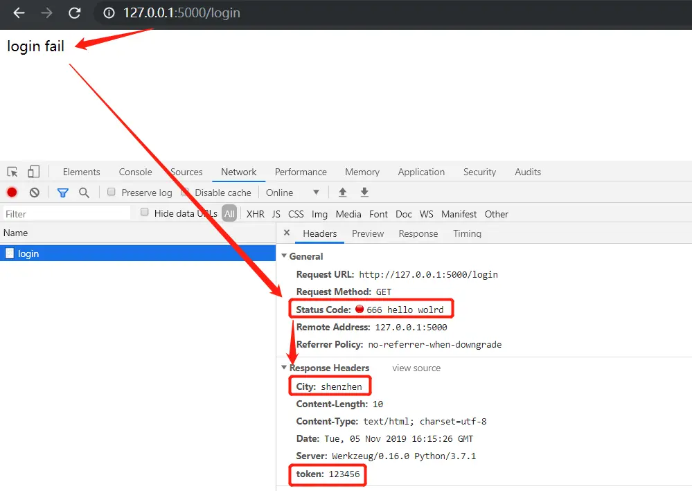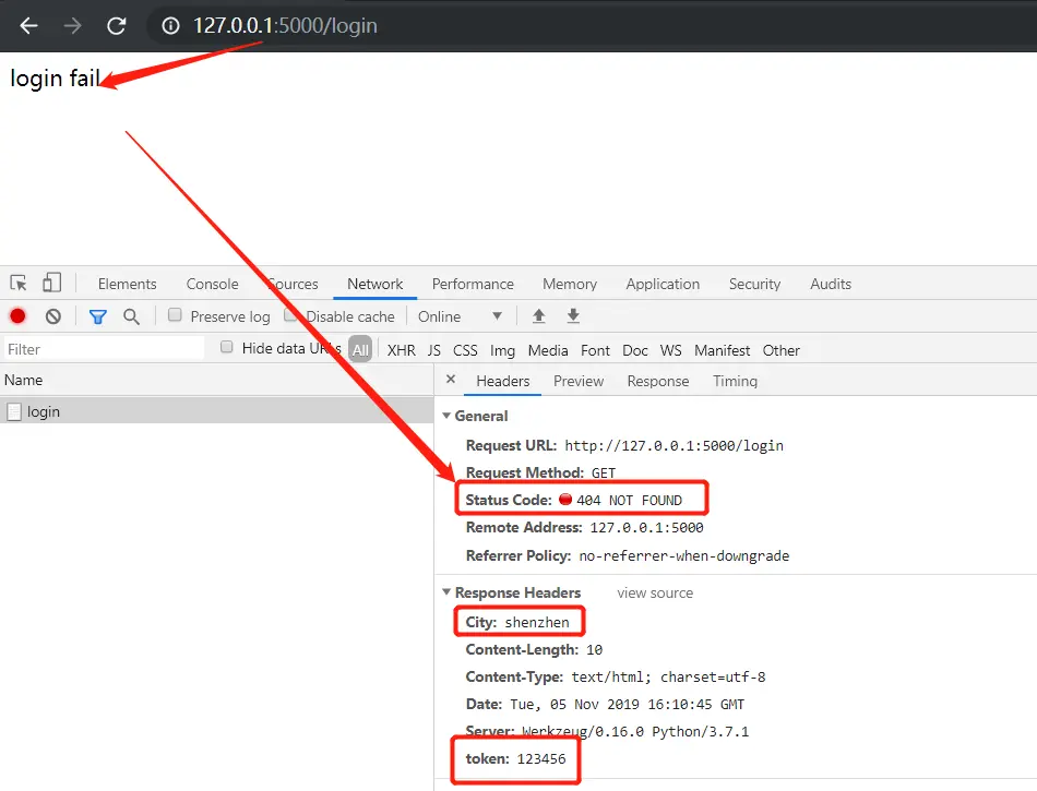 return "login fail", 404, [("token", "123456"), ("City", "shenzhen")]
