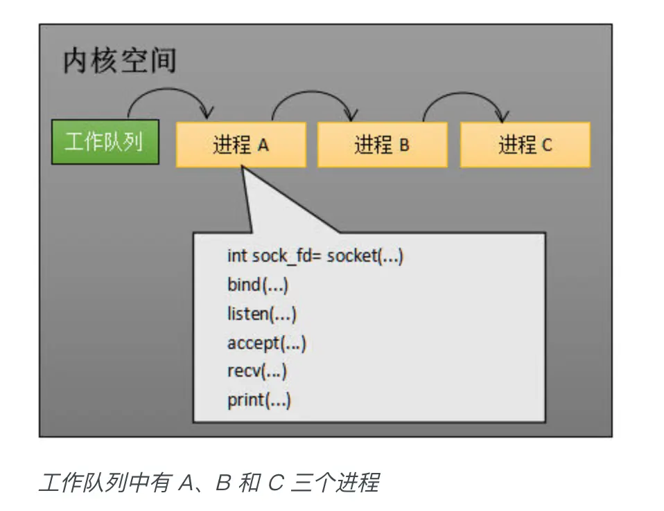 下图的计算机中运行着 A、B 与 C 三个进程,其中进程 A 执行着上述基础网络程序,一开始,这 3 个进程都被操作系统的工作队列所引用,处于运行状态,会分时执行。