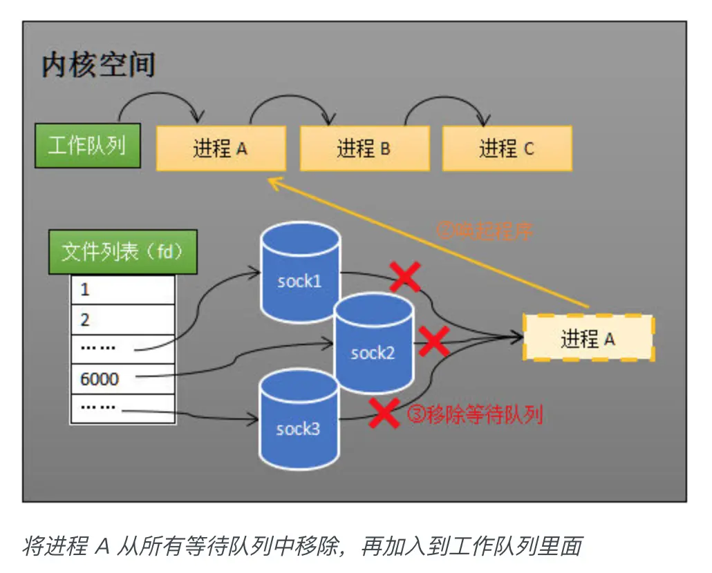 将进程 A 从所有等待队列中移除,再加入到工作队列里面