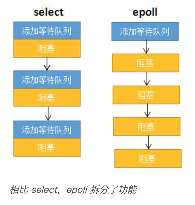 select 低效的原因之一是将“维护等待队列”和“阻塞进程”两个步骤合二为一。如下图所示,每次调用 select 都需要这两步操作,然而大多数应用场景中,需要监视的 socket 相对固定,并不需要每次都修改。epoll 将这两个操作分开,先用 epoll_ctl 维护等待队列,再调用 epoll_wait 阻塞进程。显而易见地,效率就能得到提升。