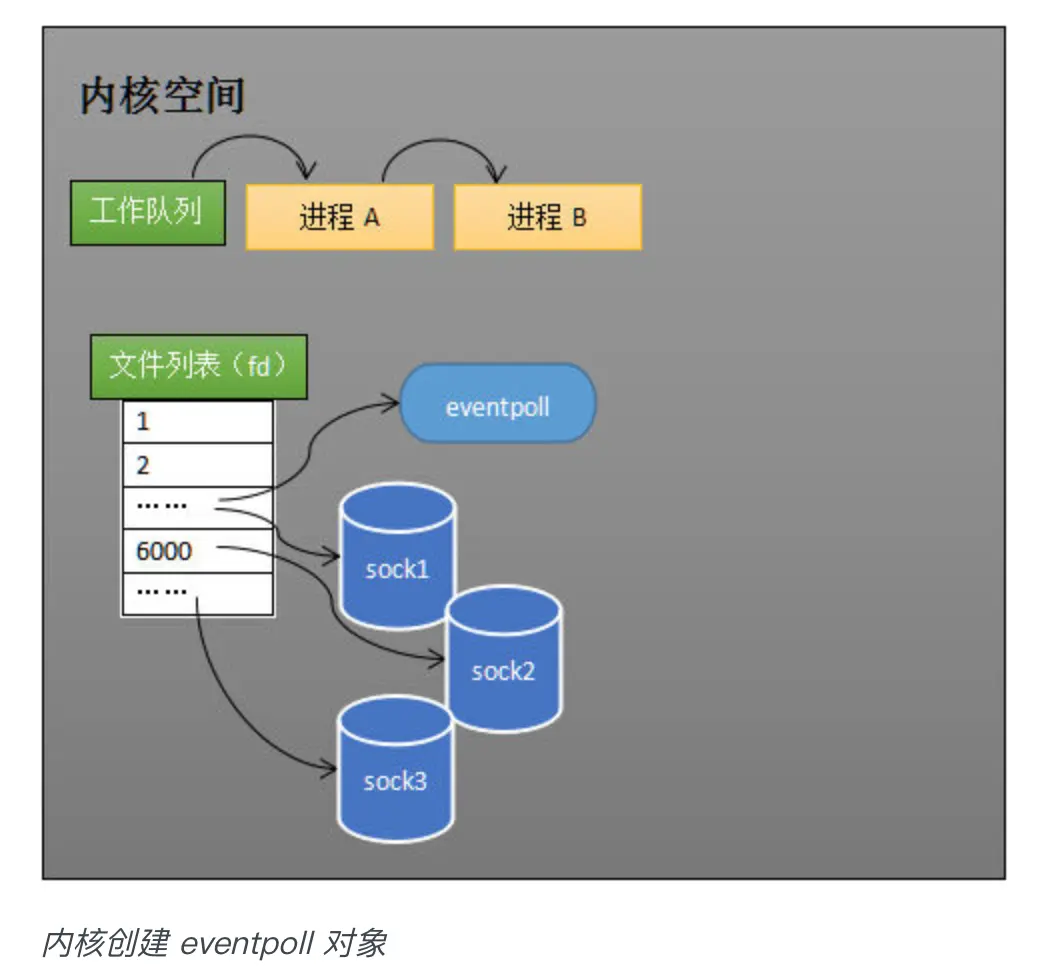 如下图所示,当某个进程调用 epoll_create 方法时,内核会创建一个 eventpoll 对象(也就是程序中 epfd 所代表的对象)。eventpoll 对象也是文件系统中的一员,和 socket 一样,它也会有等待队列。
