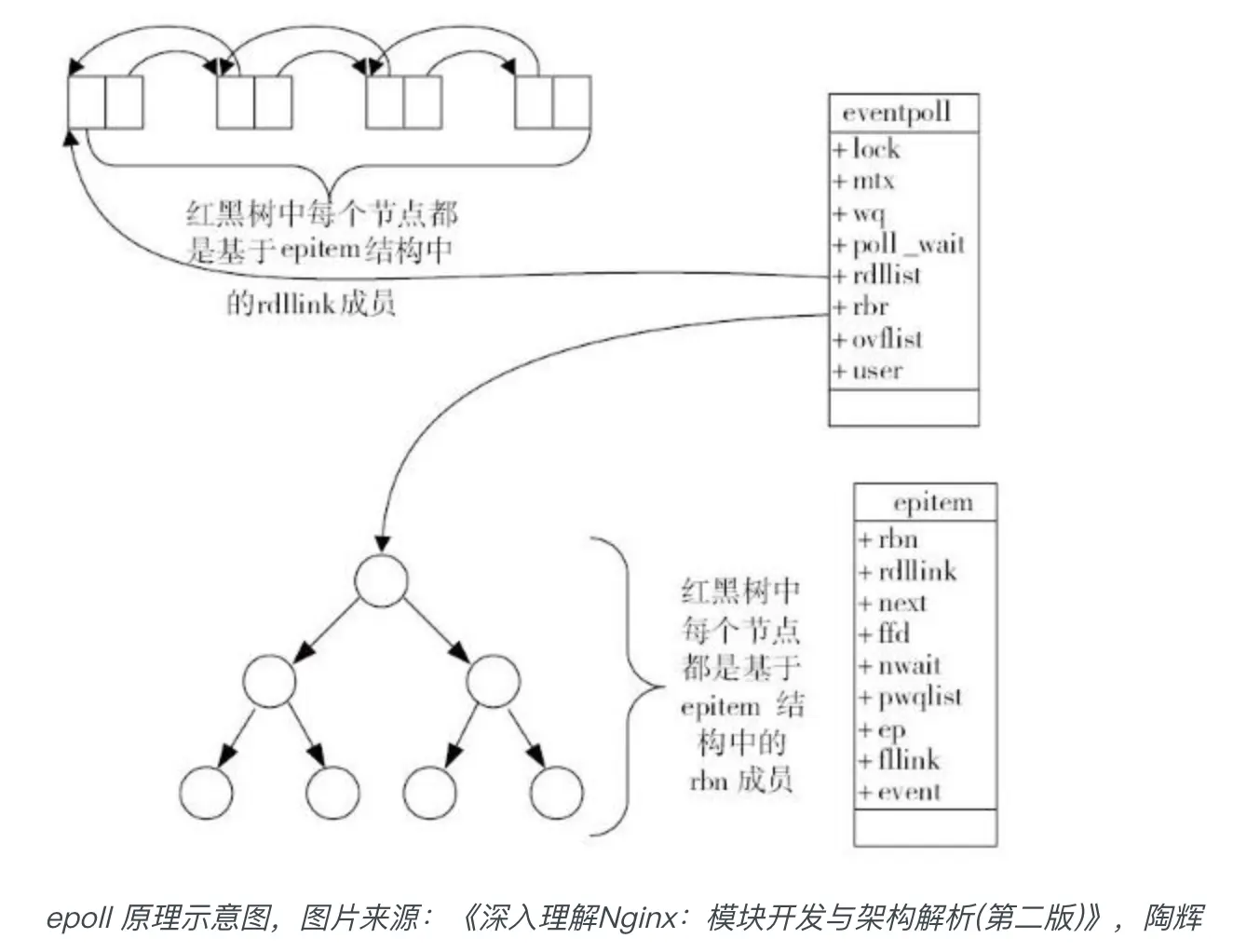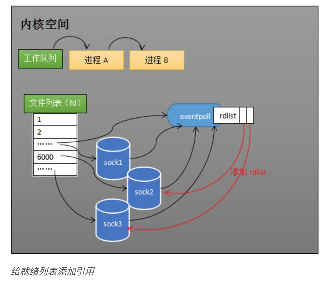 注:因为操作系统要兼顾多种功能,以及由更多需要保存的数据,rdlist 并非直接引用 socket,而是通过 epitem 间接引用,红黑树的节点也是 epitem 对象。同样,文件系统也并非直接引用着 socket。为方便理解,本文中省略了一些间接结构。